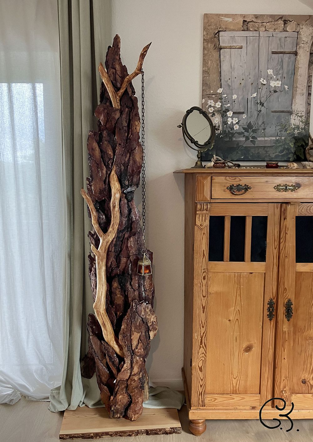 ...der Name entspringt dem Wildbach "Bayehon" im Naturschutzreservat Hohes Venn in Belgien. Dieser Bach ist wegen des moorigen Bodens kupferbraun und bietet in seinem Lauf durch verwunschene Wälder einen neun Meter hohen, traumhaft schönen Wasserfall. Eben aus diesem Bach ist dieser Stamm der Leuchte "Bayehon" mit von Witterung entstandenen kupferbraunen Kiefernrinde, ein Abbild des Wildbach.