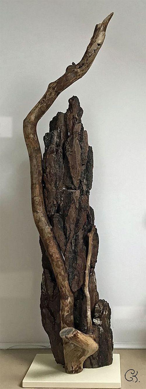 ...der Name entspringt dem Wildbach "Bayehon" im Naturschutzreservat Hohes Venn in Belgien. Dieser Bach ist wegen des moorigen Bodens kupferbraun und bietet in seinem Lauf durch verwunschene Wälder einen neun Meter hohen, traumhaft schönen Wasserfall. Eben aus diesem Bach ist dieser Stamm der Leuchte "Bayehon" mit von Witterung entstandenen kupferbraunen Kiefernrinde, ein Abbild des Wildbach.